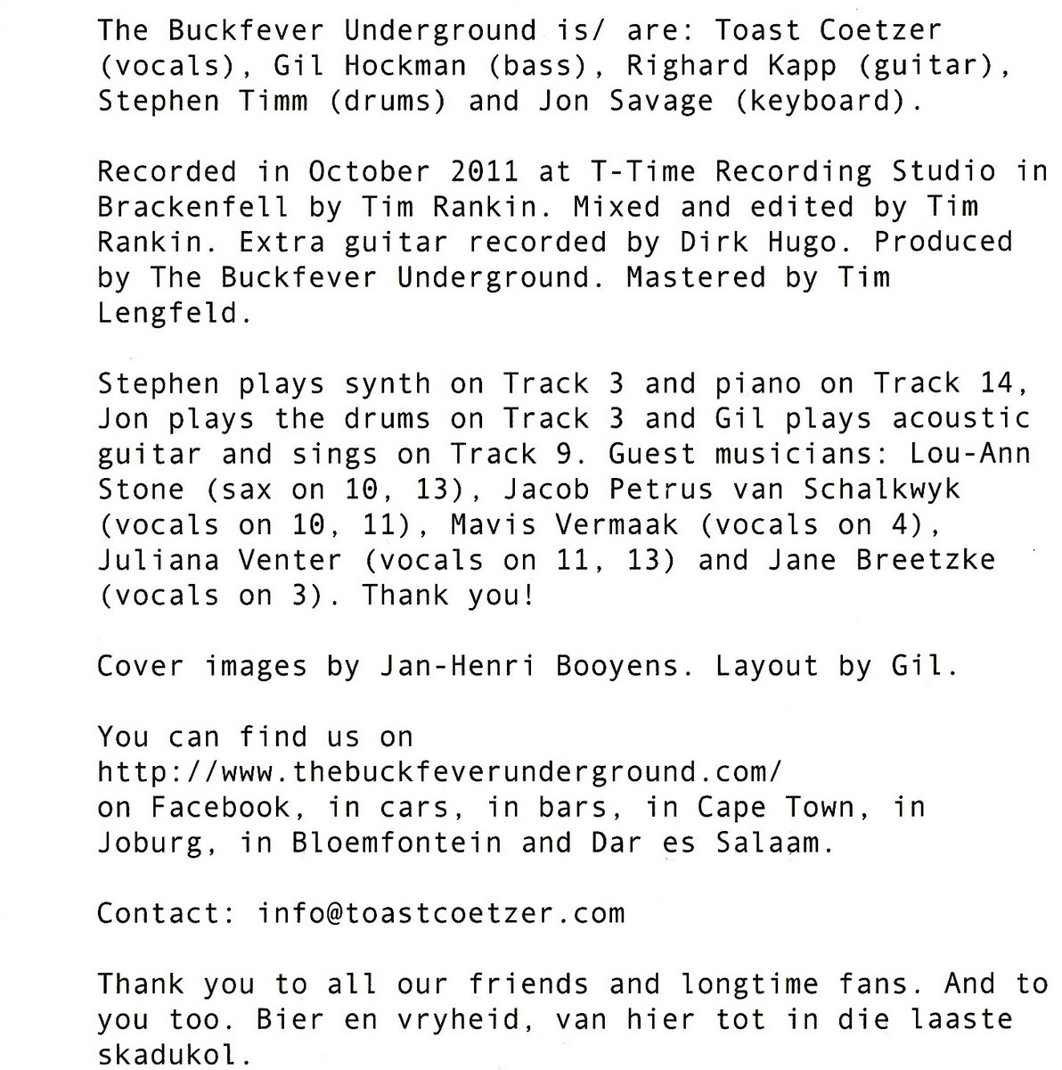 The Buckfever Underground is a South African spoken-word band. They perform poetry in English and Afrikaans with experimental music. Current members Toast Coetzer (vocals), Stephen Timm (drums), Michael Currin (guitar). Founder member: Gilad Hockman. Also: Jon Savage, Righard Kapp. Founded in 1998. On Instagram @thebuckfeverunderground ... more